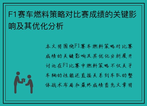 本文将围绕F1赛车燃料策略对比赛成绩的关键影响及其优化分析展开讨论。在F1比赛中,燃料策略不仅关乎车辆的性能,还直接关系到车队的整体战术布局和最终成绩。首先,文章将分析燃料的选择对赛车动力输出和车重的影响,其次探讨燃料消耗与比赛节奏的平衡问题,最后,讨论如何通过优化加油时机和燃料分配来实现最快圈速和赛程中的策略调整。通过深入分析这些方面,本文将探讨如何在多变的比赛环境中通过合理的燃料策略优化赛车表现,并确保在复杂的赛道条件下达到最佳比赛成绩。